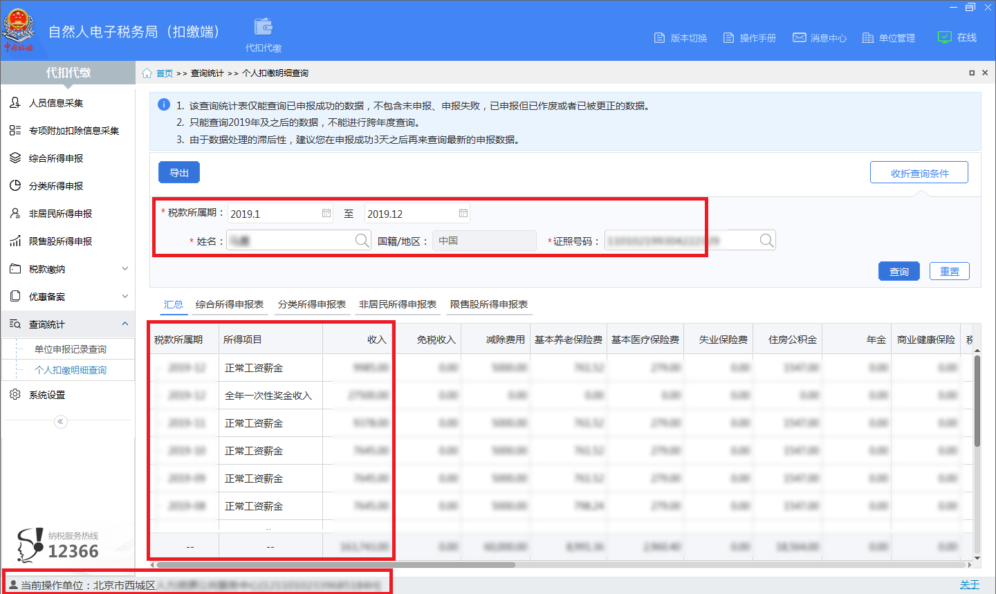 (2)2019年后单位版报税截屏。单位登录“自然人税收管理系统”,在代扣代缴项目栏的查询统计功能中点击个人扣缴明细查询(样例参见附件4
